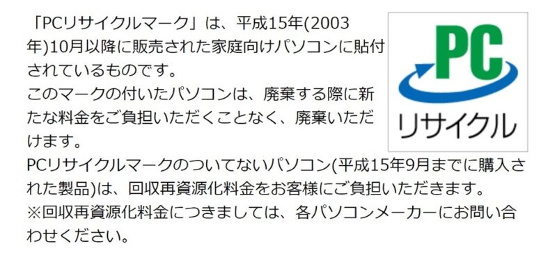 平成15年10月以前のものにはPCリサイクルマーク制度の導入前なので、「回収再資源化料金」を支払い、メーカーに回収してもらうことになります。